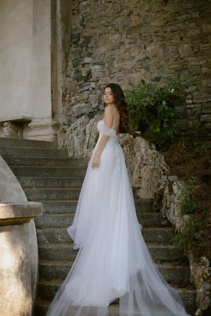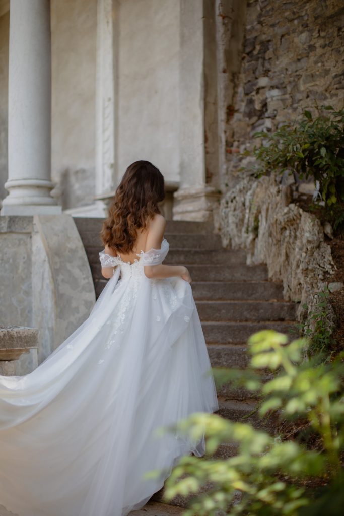 Delle ramificazioni di pizzo partono dal punto vita per sfociare nell’ampia gonna in tulle. Le maniche rinascimentali plissettate a mano, sono staccabili tramite l’utilizzo di bottoncini nascosti, cuciti tra i ricami del corsetto.