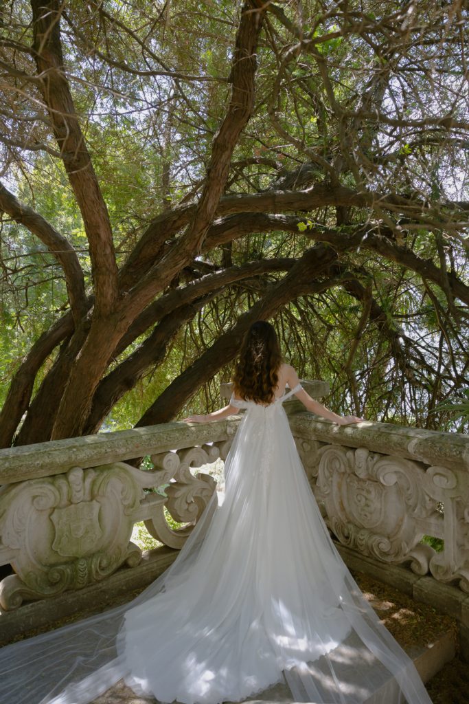 Queste maniche nella parte posteriore dell’abito, danno origine a due code in tulle che conferiscono l’idea di leggerezza, e creano una prospettiva visiva d’impatto.