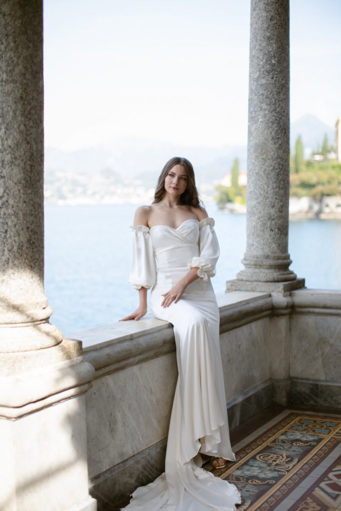Lo scollo a cuore addolcisce la linea dell’abito, e porta lo sguardo verso le maniche a sbuffo, creando così una linea off-shoulder romantica.