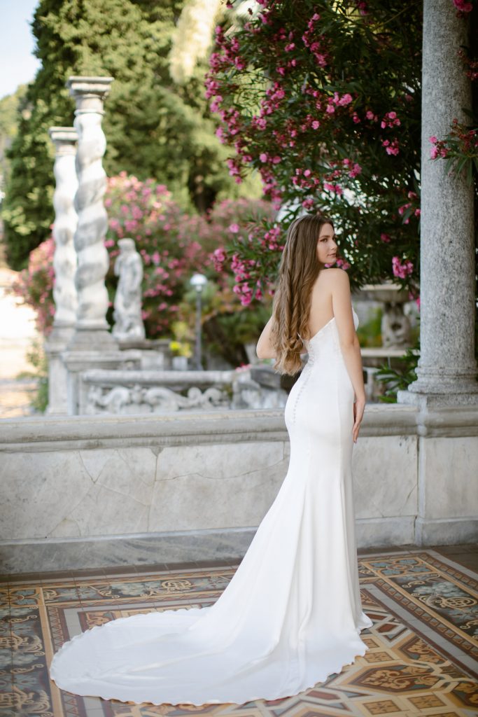 I bottoncini ricoperti a mano ton sur ton sono molto amati dalle mie spose, e percorrono la scollatura posteriore creando un incantevole decoro.